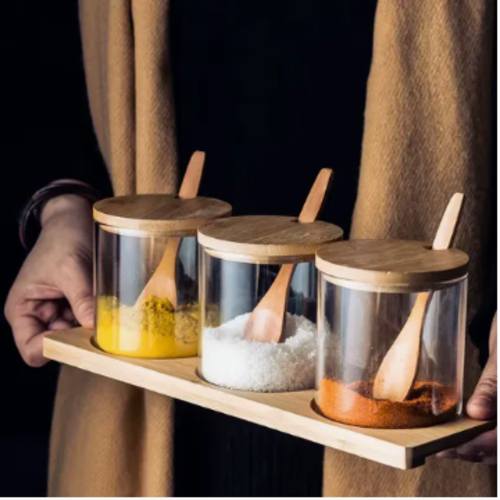 Set 3 Frascos Especieros + Bandeja + Cuchara Madera 300 Ml