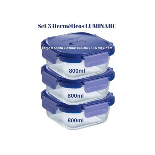 Set 3 Taper Contenedores Cuadrados Herméticos Luminarc (800 ML)