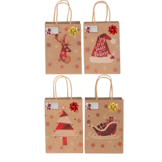 12 Bolsas De Regalo Navidad Kraft Mediana + Lazos + Stickers (33x26cm)