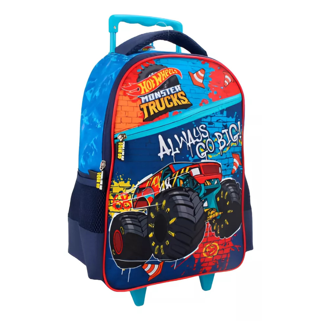Mochila con ruedas de 15 litros : Con un diseño ergonómico y una capacidad ideal, esta mochila es perfecta para transportar libros, cuadernos y otros esenciales sin esfuerzo. Sus ruedas suaves y el asa telescópica ajustable facilitan el transporte, mientras que el estampado de Hot Wheels añade un toque emocionante.