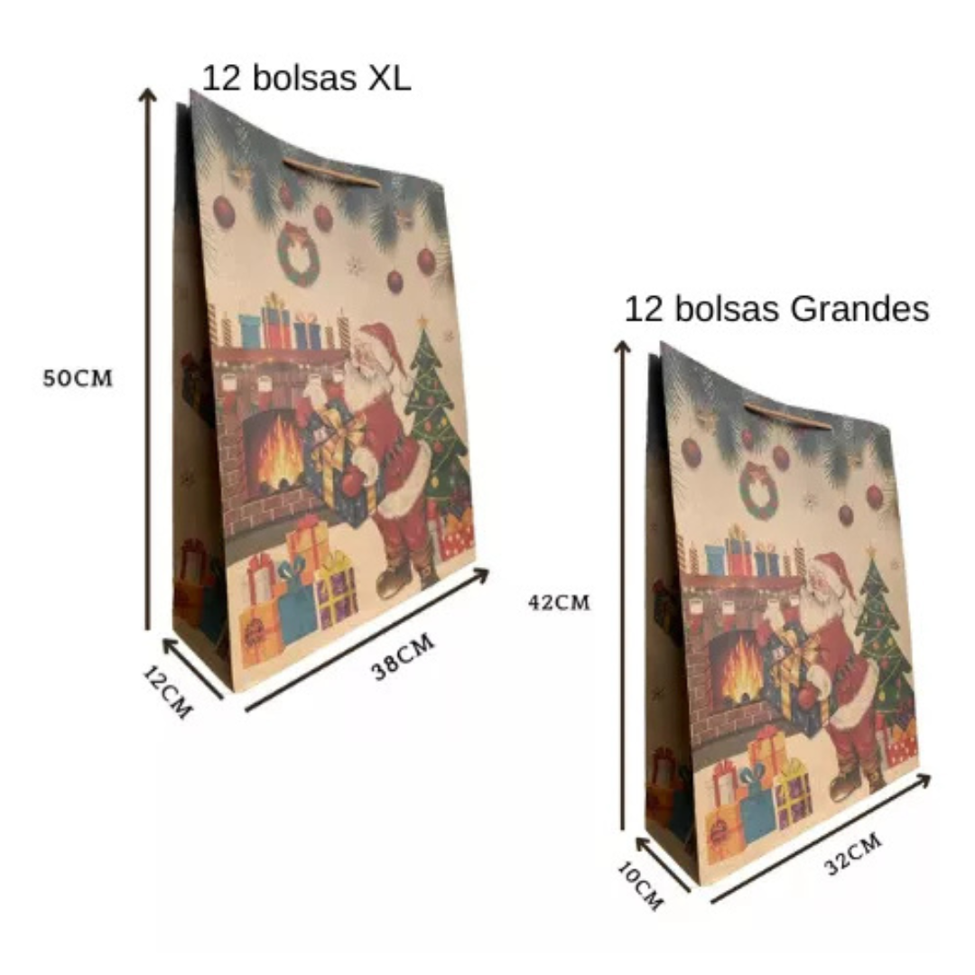 Set 12 Bolsas de Navidad Kraft XL + 12 Bolsas Grandes + Stickers
