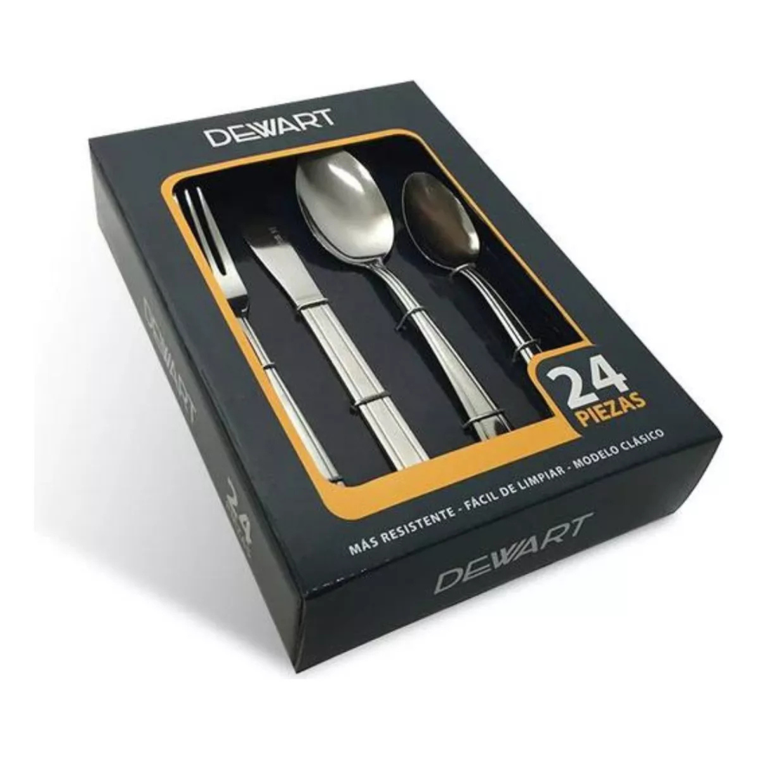 Este elegante set de cubiertos de 24 piezas en una caja Dewart está diseñado para realzar la presentación de tus comidas.